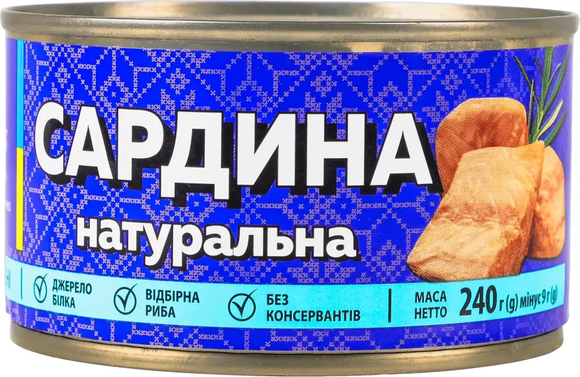 Состав: Сардина куски не менее 60%, питьевая вода, масло подсолнечное рафинированное дезодорированное не менее 2%, соль поваренная пищевая, пряности