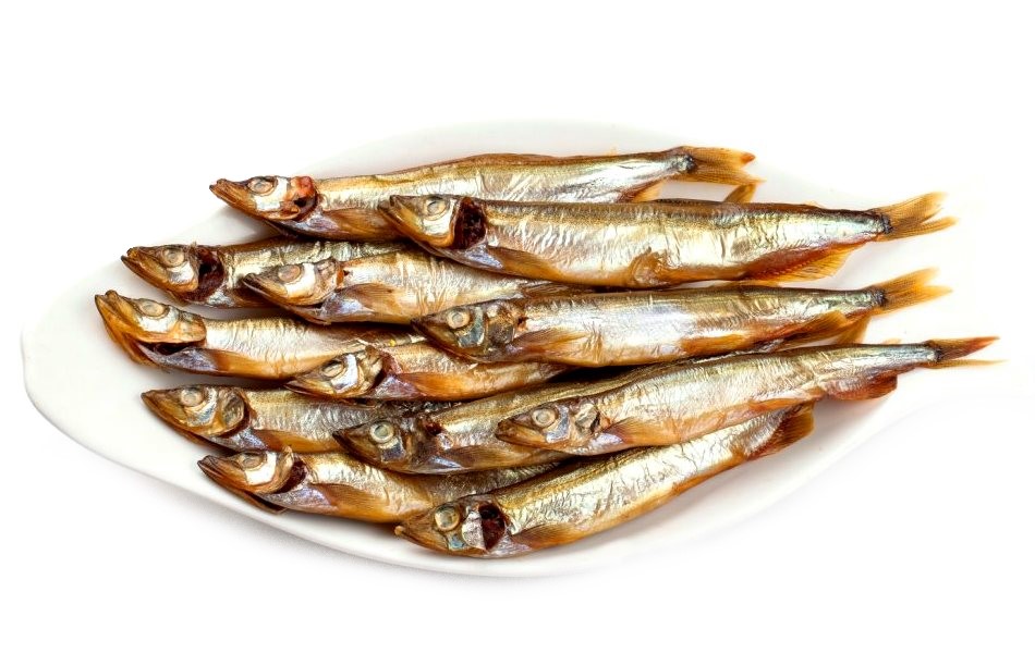 Složení: Huňáček severní (Mallotus villosus), sůl, regulátory kyseliny: E262, E260; kouř.